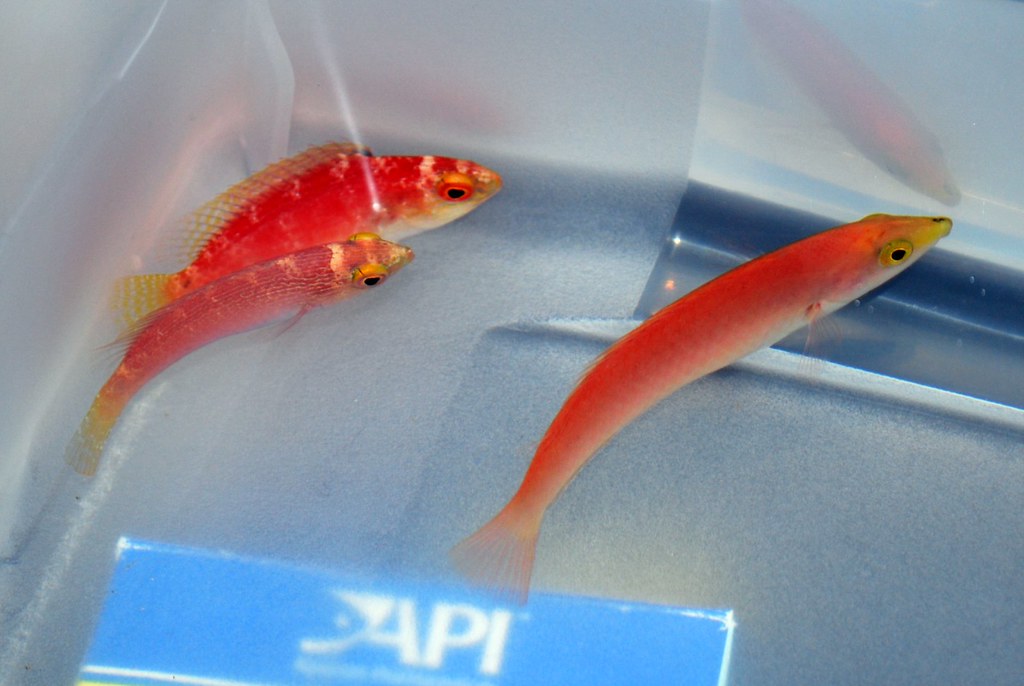 My LFS had some 'misc fairy wrasses' that were unidentified from the supplier and sold that way. Through the magic that is the smart phone I'm pretty sure I identified them correctly on the spot but wanted to be sure. I strongly suspect that the 2 on the left are juvi blue margin wrasses and am pretty certain that the one on the right is a juvi/female pencil wrasse. Any wrasse experts out there concur?