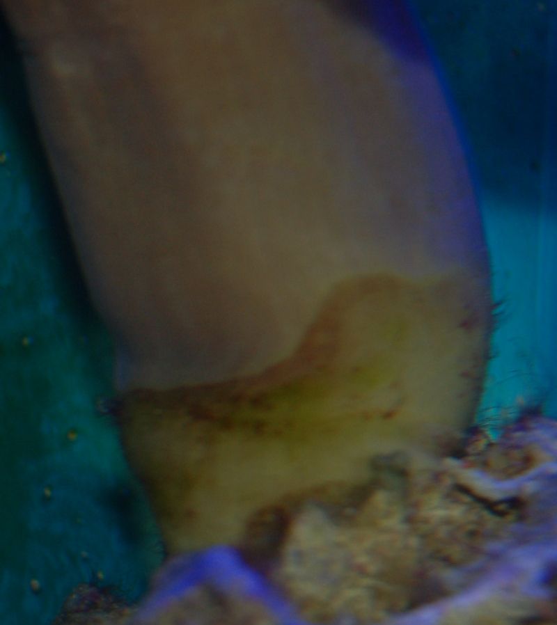 Hi, I bought a new 76 half circle tank the toadstool came with the purchase I got it home and saw the spots and the stem looking abnormal. Is it normal for the stem to be discolored at the bottom or is that an issue as well? My brother looked into it for me while I was at work and he came to the conclusion that it was most likely necrosis but we are trying to get more opinions before we try to do anything.