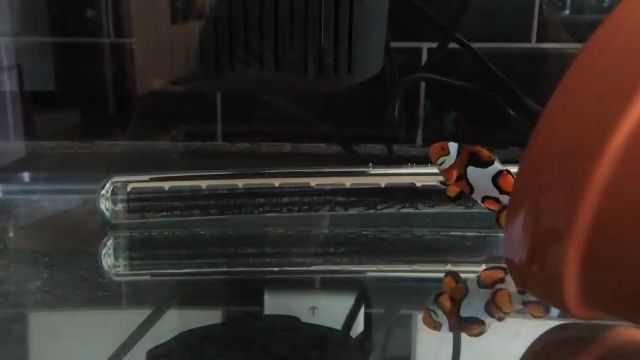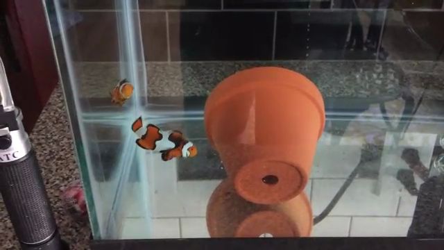 The video on top is about 10 minutes into their interaction, and the bottom one is when they first encounter each other (sorry for the reverse chronological order). It was difficult to truly catch the larger clowns aggression in that first video, because once she becomes aggressive the smaller guy does his best to stay out of sight.