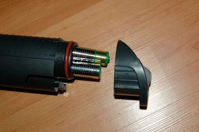 It runs on 4 battery and the battery casing is waterproof, which means the whole thing can be submerged into the water.