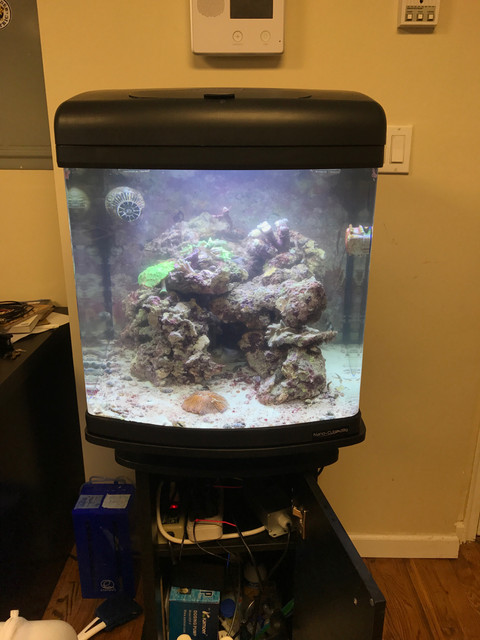 28 gallon JBJ Nanocube Advanced (LED top model) Tank and stand with some coral, one clown and one royal gramma, various inverts - starfish, crabs snails etc, Kamoer 3 chamber doser (costs $300 alone) with 2 chamber storage for part A&B calcium (or whatever else you want), with black stand with storage. I also added a pump for flow and an inline UV sterilizer his tank was professionally maintained monthly for its entire life but I just don't have time for it anymore and I'm moving. I've put over $4,000 into it between livestock and maintenance and its completely ready to go. I am selling it for just the cost of the hardware and you get everything in it!!