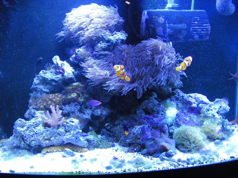 250watt 12k reeflux bulb, 250watt coralvue electronic ballast, koralia 2, reef octopus hob skimmer, approx 40-50lbs of live rock, 20lbs live sand, about 10 sea cucumbers, 6 starfish, pair of true perculas, pygmy angelfish, sixline wrasse, dozens of blue leg hermits, about 3 electric blue hermits, blue mushrooms, yellow polyps, orange zoos, green zoos, one green ricordia shroom, small kenya tree stalk, anthelia. i think thats it.