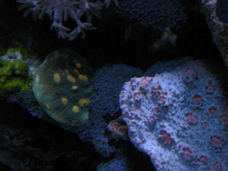 Here are 3 chalics, the blue with red eyes on top is a real fast grower. I got it about 6 months ago free from a local LFS to try and save. the small red one in the middle was a hitchhiker on a piece of rubble i bought from a local reefer. and the last one is actually a bright lime green, i bought it as a frag and won't be chopping it... I have never seen anything like it