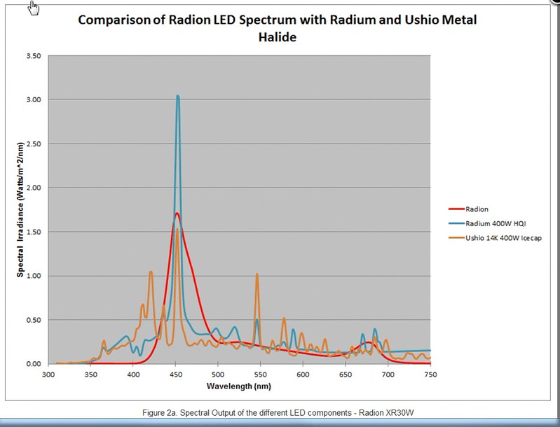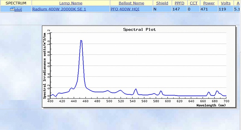 Here is the spectral plot of a Radium 400w bulb on an HQI ballast. It's been the gold standard for Sps for over a decade. You can run very high par get excellant growth & get fantastic colors.