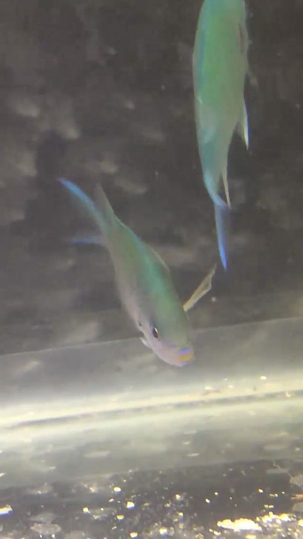 On saturday I recieved an order of black axial chromis from LA. They came and I acclimated them and placed them in their QT. Yesterday when the lights came on I inspected them for the first time real good. What I found was not good. All 6 of them have large missing patches of their colorful scales (and no it's not otics with the light). I'm talking patches larger than a quarter and the fish are only 1.5-2 inches long. It looks as though they were ripping eachother apart in their old tank. I went to feed them some mysis soaked in garlic and all but one ate. The one that is not eating is the wose though he is still hanging with the others. He has the largest patch and last night it appeared to have white fungus growing on it. Therefore, I dosed Triple Sulfa and stree guard. This morning I got up and did a bref look before runing to school. Now getting home the worse one seems to have gotten rid of the cottony looking fuzz but still has some issues. I dosed the tnk again ith triple sulfa and this time also added a packet of E.M. Erythromycin. I feed again some cyclopeze soaked in selcon. The same fish didn't eat again. I will try again in 3 hours with some mysis. The pectoral fish on the side with the sore seems almost paralysied with only slight movements. It also apears to have some damage to it though it doesn't seems to impare it's swiming ability.