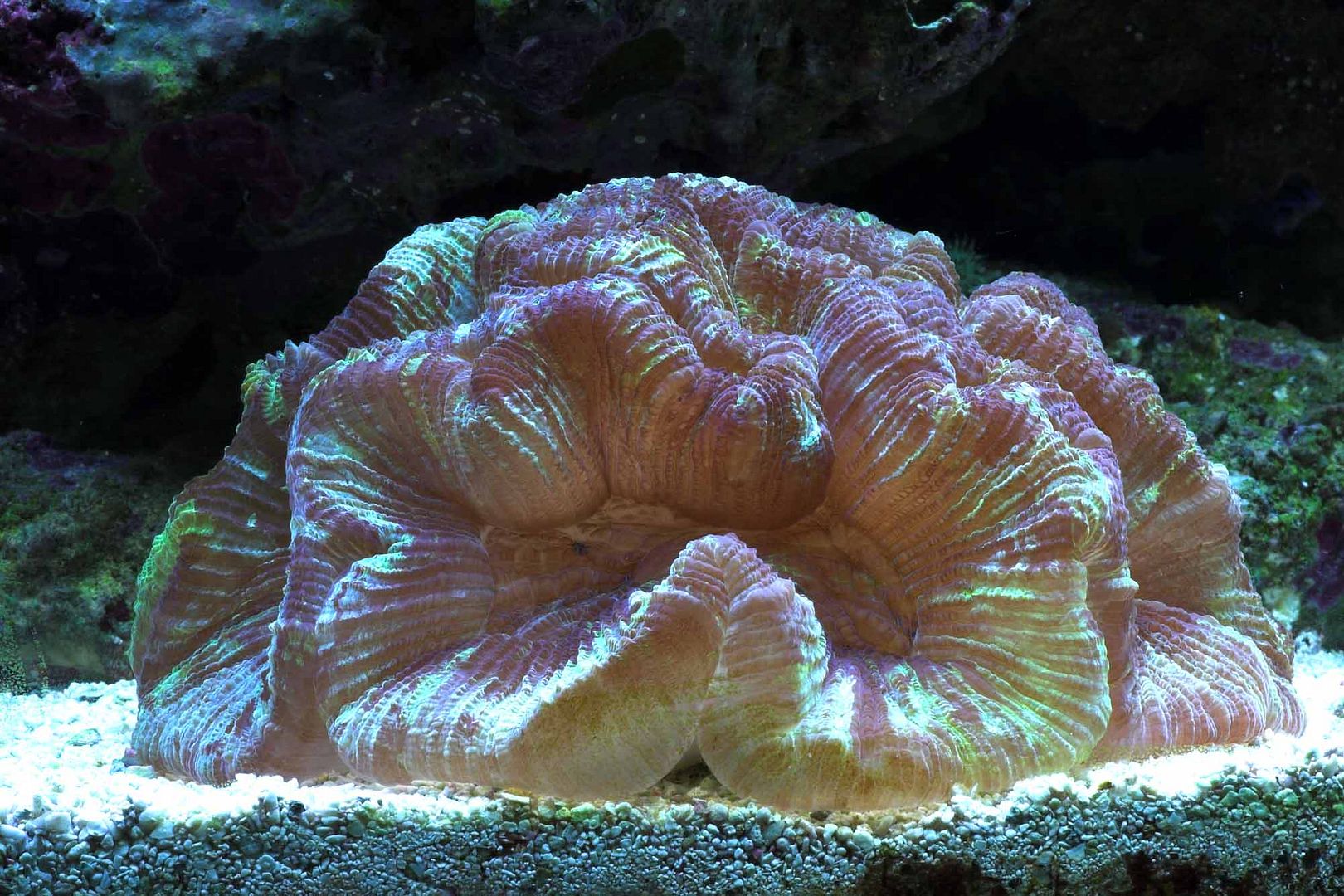 I've had this open brain for 2 weeks now, and it seem to fluff up quite nicely, but it seems to be getting TOO large for the avialable space...One side is pressing up against the glass about 3/4 inch, and on the opposite side it is up about 3/4 inch on top of some tonga coral.