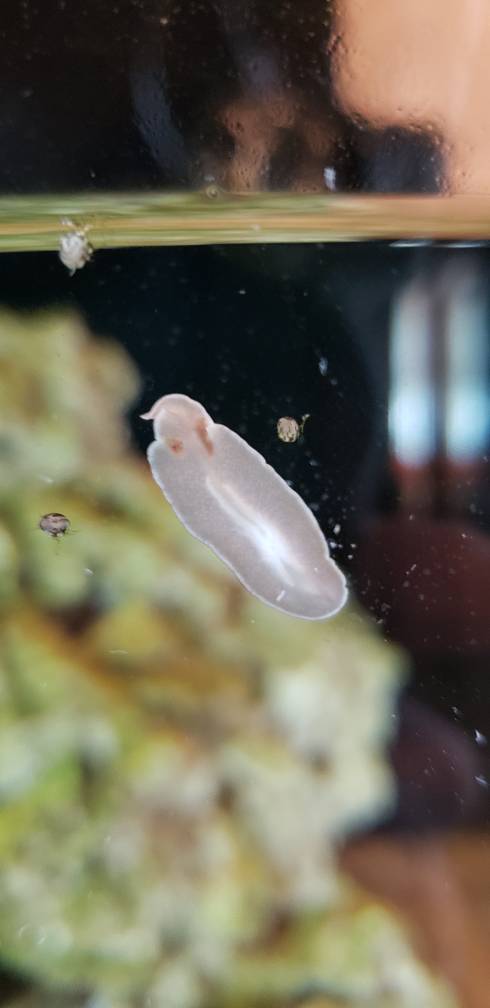 It's about a 1/2 inch from top to bottom and roams the tank moving like a slug![]()