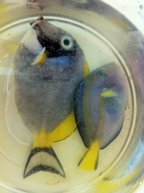 The powder blue had no signs of anything, he went from looking fine to getting the white dots like the blue in the pic above to it's colors fading and dying within 36 hours. It might have been the stress of being caught and put into the QT that did him in, I do not know.