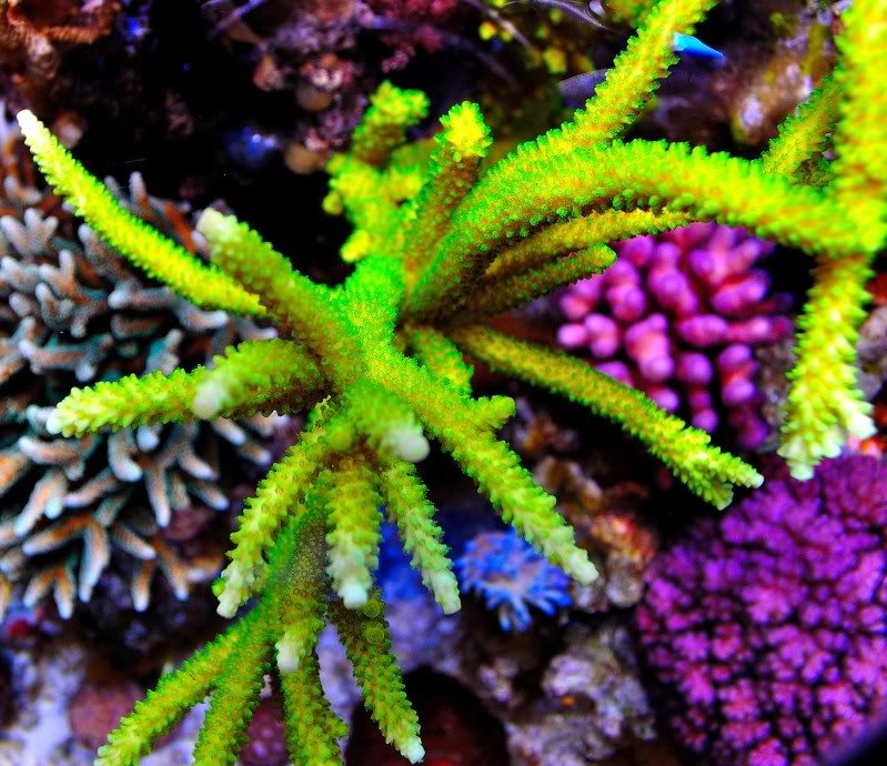 I bought the frag in pic one ( the duller of the two green acros) from my LFS and it was sold to me as a " Bali green slimer" , when I got it it looked just like it does now. Same color. I bought the second green acro ( the bright one ) from vivid aquaria and it arrived yesterday. All corals are doing great. I'm running the reef breeders photon v2 pro 48", water parameters seem fine and I havr been dosing with " Kalk plus 2 " twice a week. I just started feeding with reef-roids.